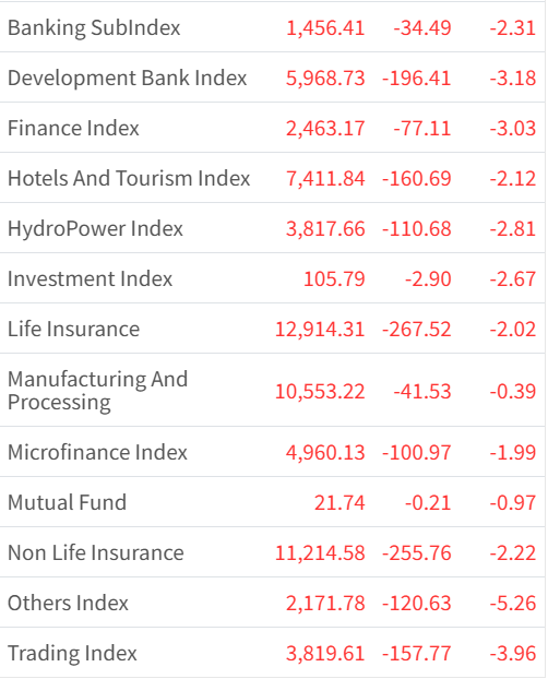All the sector closes in RED and more than 9 index are fall by 2%. Highest fall is recorded in others index, falling by 5.26% and lowest fall is recorded in manufacturing and processing index, the index looses only 0.39%.