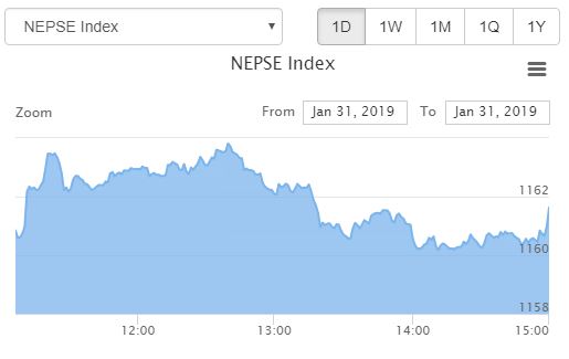 The local bourse at Nepal Stock Exchange has recorded a gain of 1.04 points to end the last trading day of the week. The market which had started at 1,160.39 points gained 1.04 points to close at 1,161.63 points.