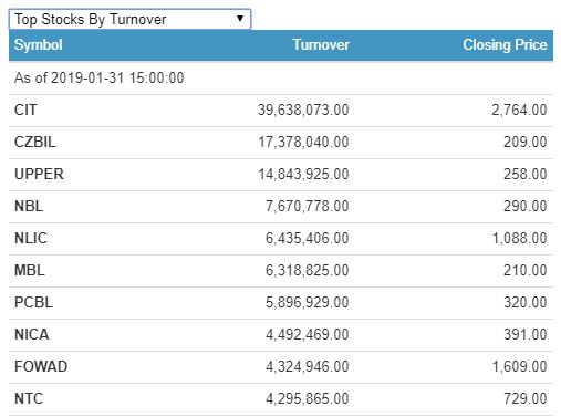 Citizen Investment Trust (CIT) was the top stock based on turnover as shares worth Rs 3.96 crore were traded during the day. Similarly, Citizens Bank International Limited (CZBIL) was the top stock based on units traded as 83,921 units were traded during the day.