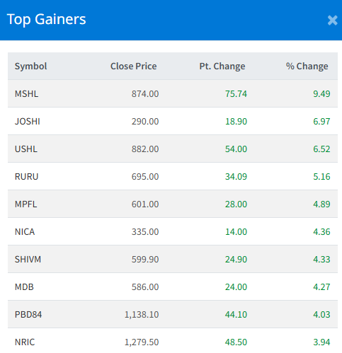 Mid Solu Hydropower Limited (MSHL) led the gainers' list by 5.32% each.