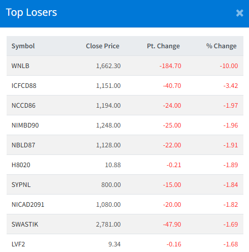 Meanwhile,Wean Nepal Laghubitta Bittiya Sanstha Limited (WNLB) recorded the steepest drop, falling 4.23%.