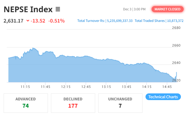 The Nepal Stock Exchange (NEPSE) recorded a loss today, losing 13.52 points (0.51% ) to settle at 2,631.17. This follows a 0.53 point loss in the previous session.