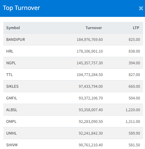 Bandipur Cablecar and Tourism Limited (BANDIPUR) topped the turnover chart, amounting to Rs. 18.49 crores. The stock closed at Rs. 825.00.