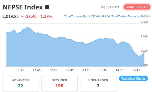 In today's trading session, the Nepal Stock Exchange (NEPSE) Index closed at 2,019.85 points, as the index experienced a considerable loss of 28.40 points or 1.38% compared to the previous day's closing. On Monday, the index experienced a marginal loss of 3.21 points.