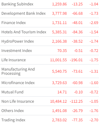 Among the sub-indices, all sub-indices closed red, "Finance" lost the highest 2.69 percent while the "Mutual Fund" and "Investment" sub-index lost the least 0.72 percent each.