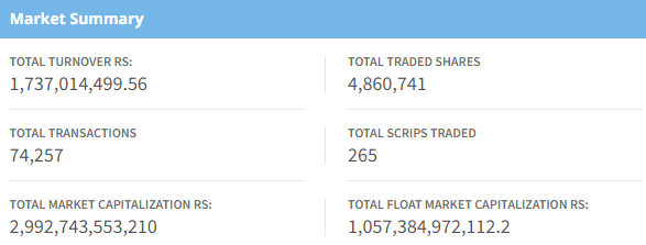 During today's trading, a total of 265 scrips were exchanged through 74,257 transactions, with a substantial volume of shares traded amounting to 4,860,741, representing a turnover of Rs. 1.73 Arba. Market capitalization stood at Rs. 29.92 Kharba, with a float market capitalization of Rs. 10.57 Kharba.