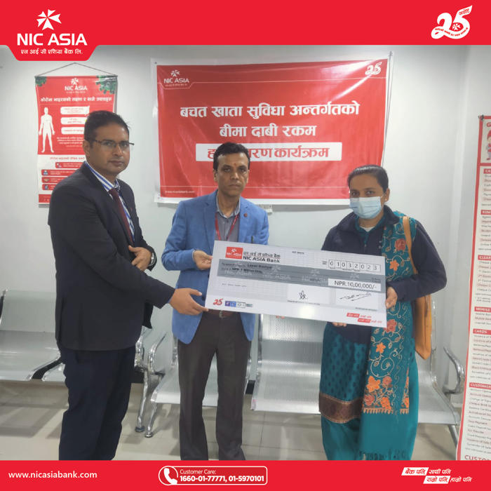 NIC ASIA Bank has handed over the accidental death insurance claim from its Rupandehi branch that amounts to Rs 10 lakh to the nominee of its account holder Late Arjun Kharal from Suddhodhan gaupalika of Rupandehi having his Sarbashrestha Saving account with the bank.