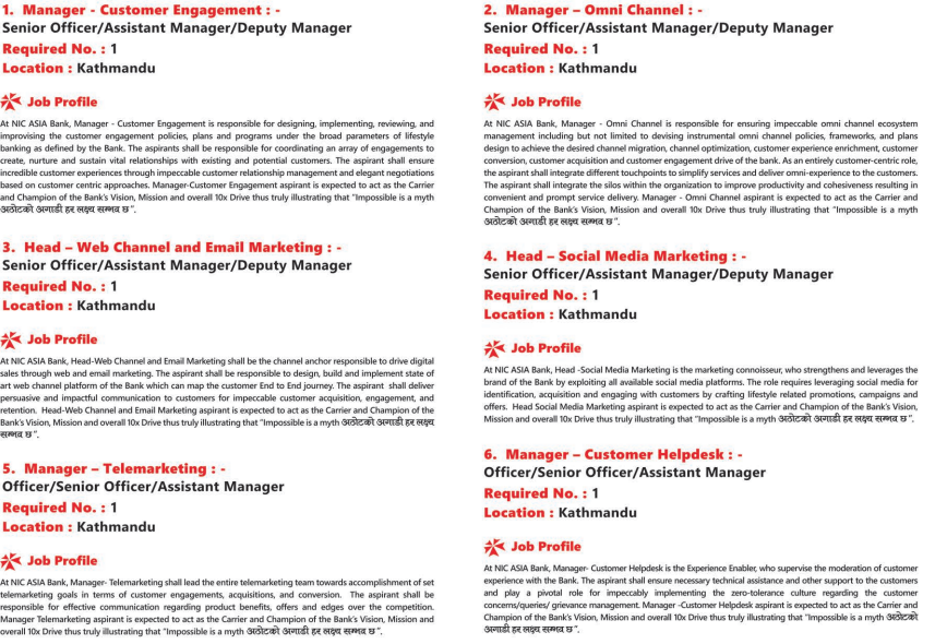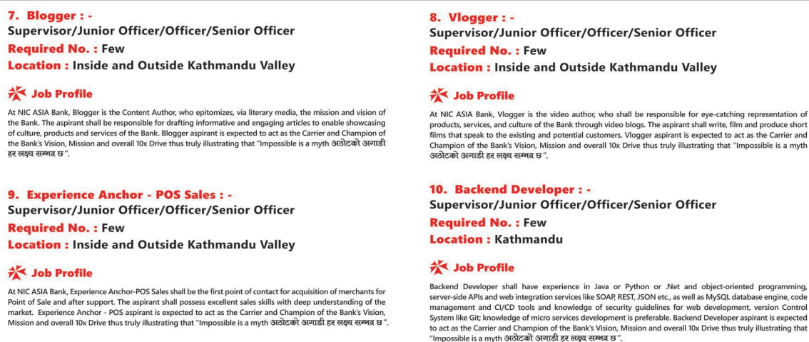 NIC ASIA Bank Opens Job Vacancies For 16 New Posts; From Manager, Blogger, Developer & Social Media Handler All Eligible Candidates Can Apply
