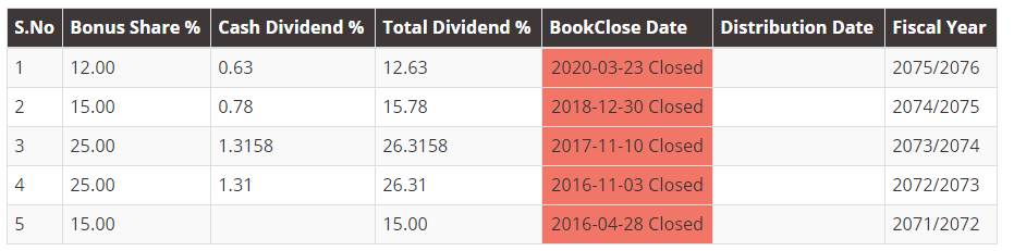 The 108th meeting of the board of directors held on Mangsir 09 had decided to distribute 19% bonus shares and 1% cash dividend from the paid-up capital. The paid-up capital of the company is Rs. 45,36,17,500. Thus, bonus shares totaling Rs. 8,61,87,325 and cash dividend totaling Rs. 45,36,175 will be distributed.