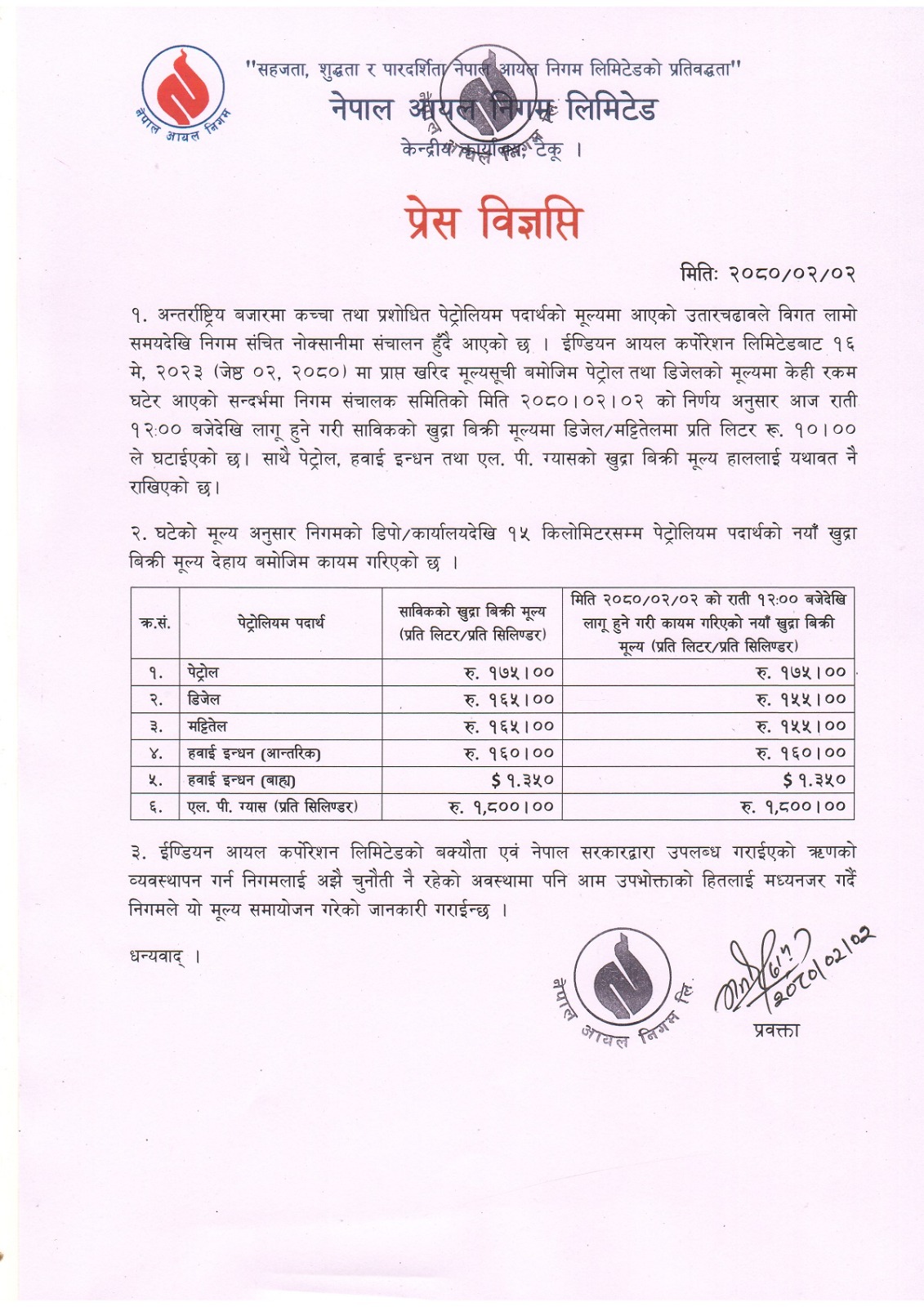 NOC issue a press release to notify of the revised prices. According to the NOC, the price of Diesel and Kerosene has been reduced to Rs. 155 per litre.