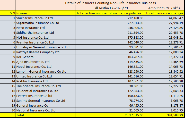 The insurance companies are competing with each other to increase their premium collection. Throughout the first eleven months of the fiscal year 2078/79, the non-life insurance companies collected a total premium of Rs 34.15 Arba, out of its 2,517,315 total active insurance policies.