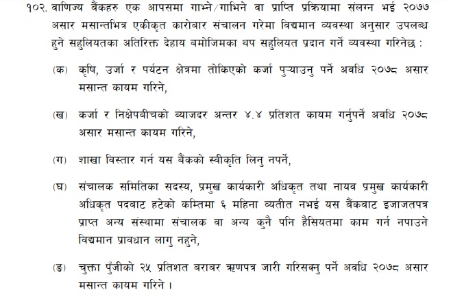 - The requirement that banks need to issue debenture worth 25% of paid up capital will be extended till Ashad 2078