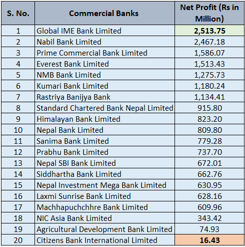 Meanwhile, the Citizens Bank International recorded the least net profit among commercial banks of Rs. 1.64 Crores.