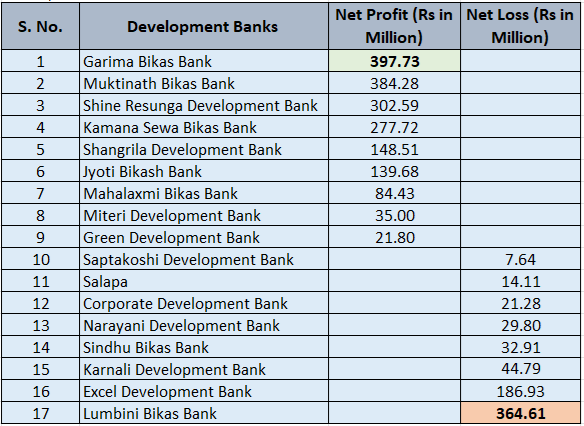 Furthermore, seven banks within the development banking sector, including Narayani Development Bank, Karnali Development Bank, Corporate Development Bank, Sindhu Bikas Bank, Salapa, Lumbini Bikas Bank, and Excel Development Bank, reported net losses for the month.