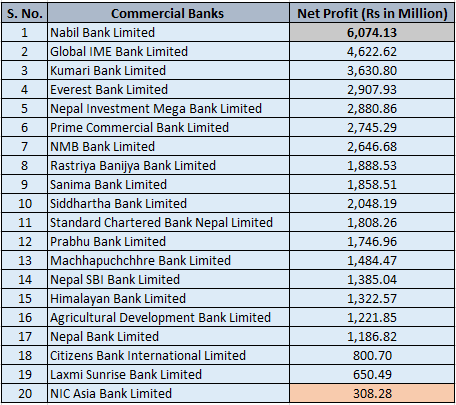 Meanwhile, NIC Asia Bank Limited recorded the least net profit among commercial banks at Rs. 30.82 Crores.