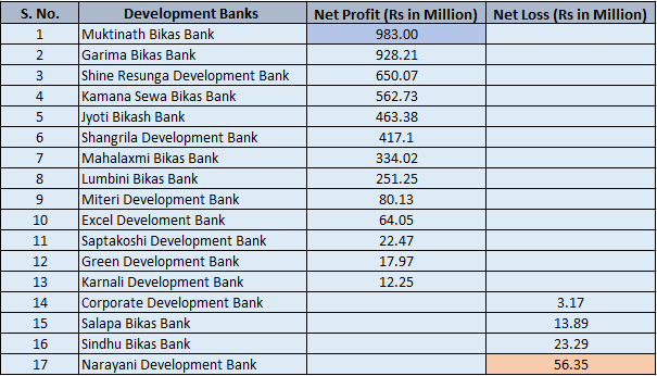 Furthermore, four banks in the development banking sector Corporate Development Bank, Salapa Bikas Bank, Sindhu Bikas Bank, and Narayani Development Bank reported net losses during the period. Narayani Development Bank posted the highest loss of Rs. 5.63 Crores among the development banks.