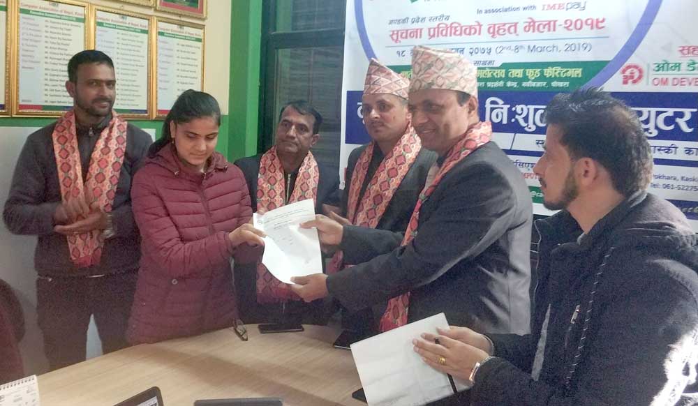 Om Development Bank, under its CSR initiative, has initiated a computer course for blind and visually impaired students in Pokhara. The development bank has provided financial support for the training program which was also supported by Kaski division of Computer Association of Nepal. The training event was inaugurated by CEO of the development bank Mr. Bishwo Mohan Adhikari amid a program.