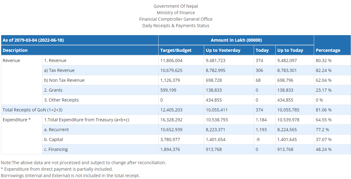 Meanwhile, just 48.21% of Rs. 1.89 Kharba financing amount has been spent. The financing budget is used to repay the government's loan principal and interest, as well as to make investments.