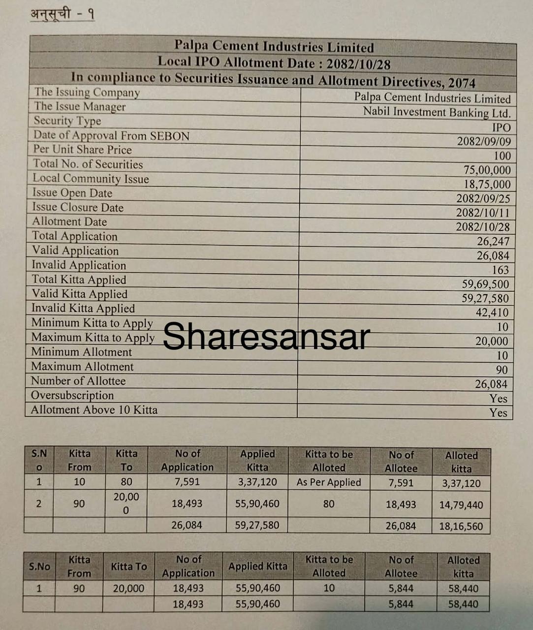 The IPO allotment for Project-Affected Locals of West Nawalparasi (Former Nawalparasi District) by Palpa Cements Industries Limited was concluded today, 28th Magh, 2082.