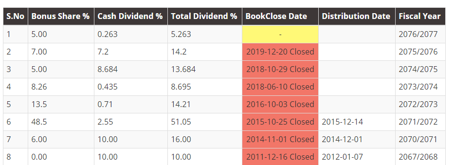 The company's 483rd meeting of the board held on Poush 03 has proposed a 0.263% cash dividend and a 5% bonus shares from the paid-up capital. The paid-up capital of the company is Rs. 91,72,81,704. Thus, the cash dividend amounts to Rs. 24,13,900 and the bonus shares are worth Rs. 4,58,64,086.
