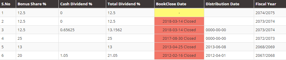 The 132nd Board meeting held on Falgun 23, 2076 had decided to propose the following dividend. It's current paid-up capital stands at Rs 2 arba, which after the adjustment of bonus will reach Rs 2.25 arba. The dividend history of PLIC is: