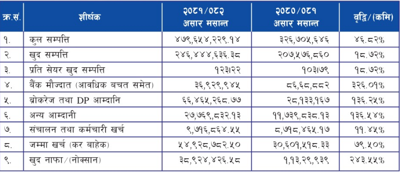 Property Wizard Limited reported notable growth in its financial position in FY 2081/82 compared to the previous year. The company’s total assets increased by 46.82 percent to Rs. 47.96 crore. Income from brokerage and DP services surged by 136.25 percent, supported by higher market activity, although other income declined. Despite a rise in operating and employee expenses, the company recorded a significant turnaround, posting a net profit of Rs. 3.89 crore, marking a sharp increase of 243.55 percent year-on-year, reflecting improved operational efficiency and earnings strength.