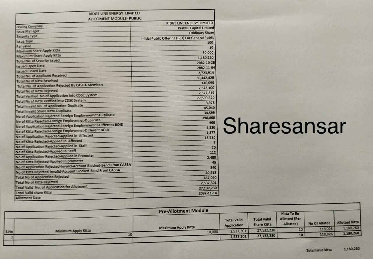 Ridge Line Energy Limited's IPO allotment was concluded today at the premises of the issue manager, Prabhu Capital Limited, Hattisar, Kathmandu.