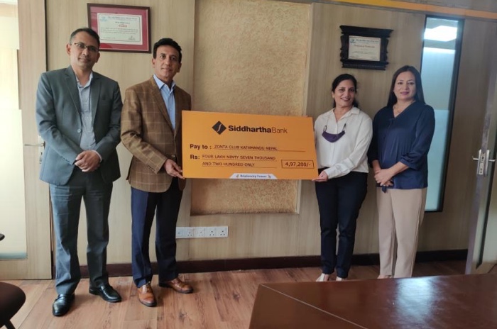 Siddhartha Bank has handed over a check of Rs 4,97,200 to Zonta Club of Kathmandu under its Corporate Social Responsibility (CSR) program. The funds will be used for Zonta’s campaign to raise awareness of domestic violence.