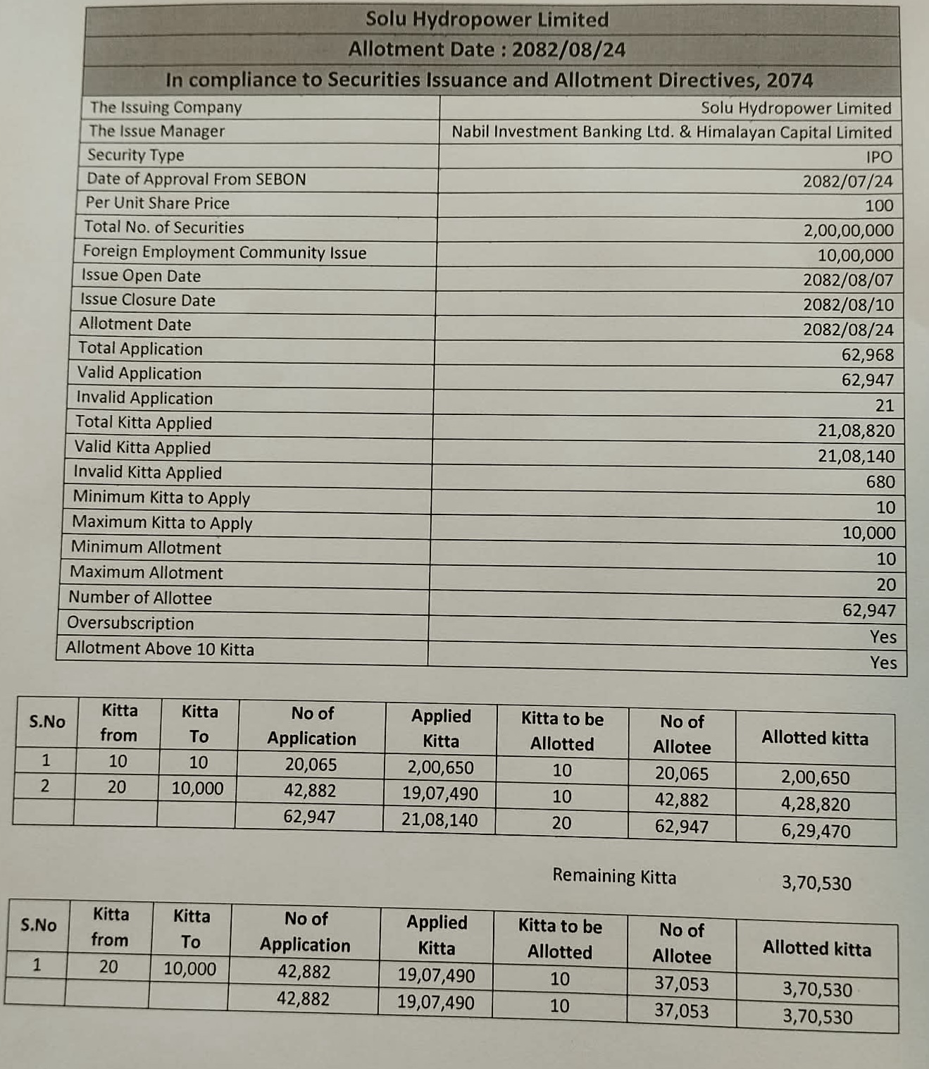 Solu Hydropower IPO Allotment Concludes: 25,894 Applicants Get 10 Units, 37,053 Get 20 Units via Lottery System