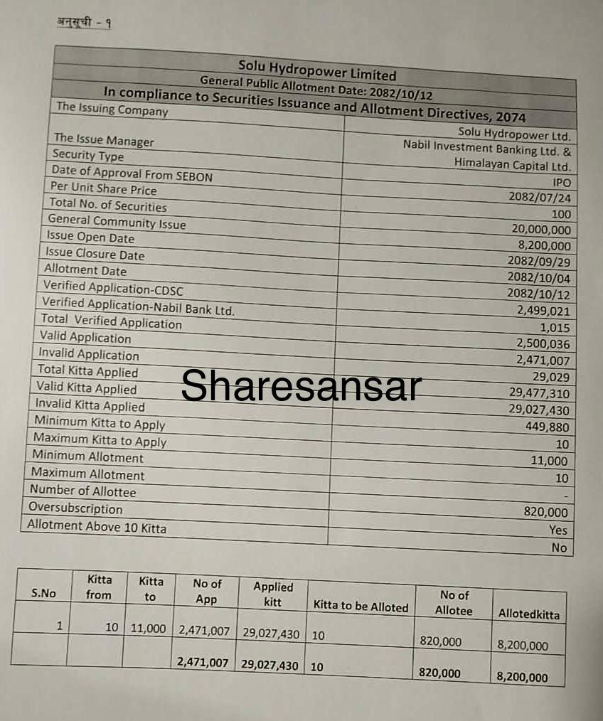 Solu Hydropower Limited IPO Allotment Concludes: Lucky 820,000 Applicants Allotted 10 Units Each via Lottery System
