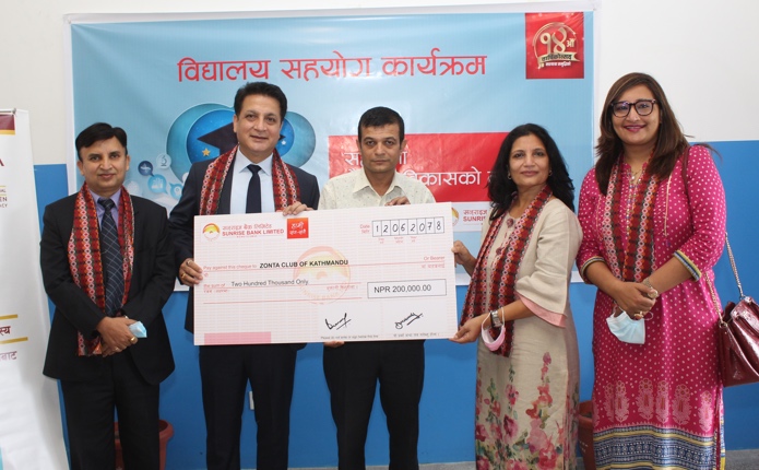 Sunrise Bank, under its CSR initiative, has handed over financial support of Rs 2 lakh to Zonta Club Kathmandu to facilitate tech-based education at a public school.