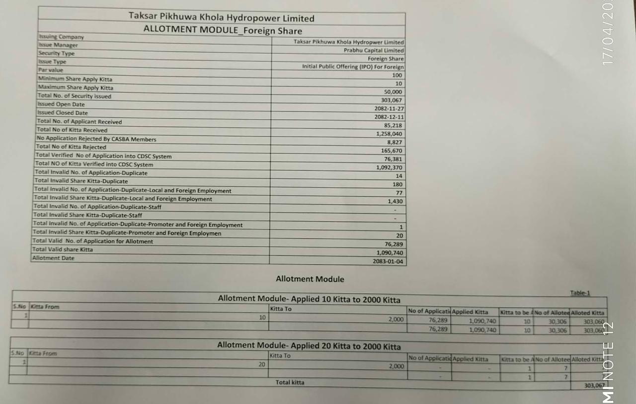 Taksar Pikhuwa Khola Hydropower Limited IPO Allotment Concludes For Nepalese Citizens Working Abroad: Lucky 30,306 Applicants Allotted 10 Units Each via Lottery System