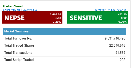 22,040,516 shares traded hands via 91,559 transactions. The trading of 202 scrips brought the total market turnover to a little over Rs. 9.53 Arba. While the float index lost 0.29 points and closed at 167.55, the Sensitive index is at 452.29 after gaining 0.92 points.