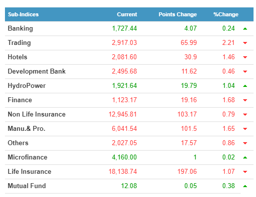 Four sectors gained today while the rest of the sectors closed red. While Hydropower gained the most 1.04%, Trading lost the most 2.21%.