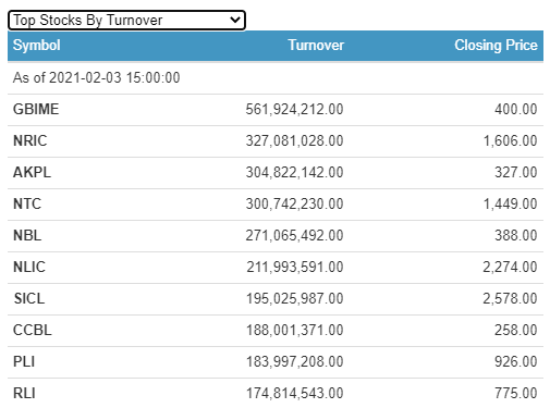 Global IME Bank Limited (GBIME) has the highest individual scrip turnover of a little over Rs. 56.19 crores. The units of NMB50 traded the most.