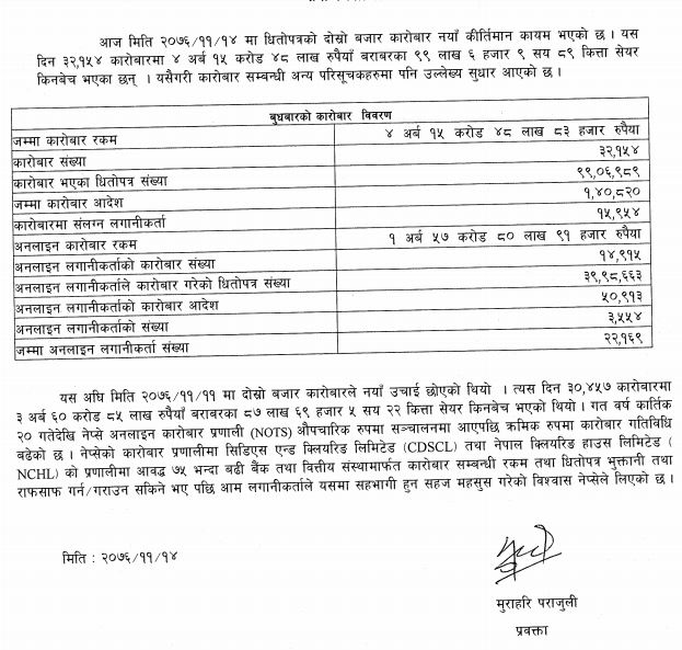 Nepal Stock Exchange (NEPSE) has published a notice stating the new record market has set on Falgun 14, 2076. On this day, the turnover stood at Rs 4.15 arba involving 99.6 lakh unit shares through 32,154 transactions.