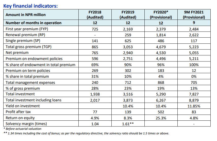The company reported a profit after tax of ~NPR 83 million during 9M FY2021 on a total asset base of NPR 10,141 million as of mid-April 2021.