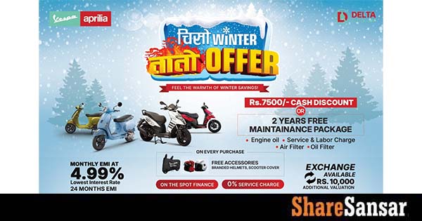 Delta Autocorp Pvt. Ltd. has launched the winter campaign “Chiso Winter, Tato Offer” for Vespa and Aprilia scooters, running from 9th Poush 2082 to 8th Falgun 2082 (24th December 2025 to 20th February 2026). Customers can avail a flat cash discount of Rs. 7,500 or a 2-year free maintenance package covering engine oil, filters, servicing, and labour.