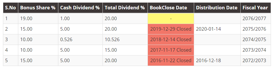 The company's 124th meeting of the board held on Poush 05 has proposed a 19% bonus shares and 1% cash dividend from the paid-up capital. The paid-up capital of the company is Rs. 22,40,31,500. Thus, the bonus shares are worth Rs. 4,25,65,985 and the cash dividend is worth Rs. 22,40,315.