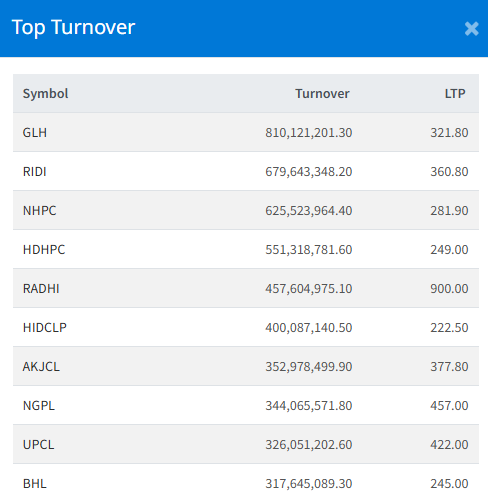 GreenLife Hydropower Limited (GLH) topped the turnover chart, amounting to Rs. 81.01 crores. The stock closed at Rs. 321.80.