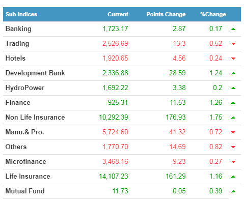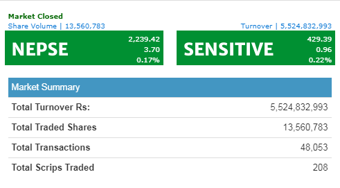 The NEPSE index gained a minimal 3.7 points and closed at 2,239.42. The index opened at 2,264.27 and made an intraday high at 2,266.44. With the intraday low at 2,229.13, the index finally closed at 2,239.42, which is a 0.17% upwards tick from yesterday's close.