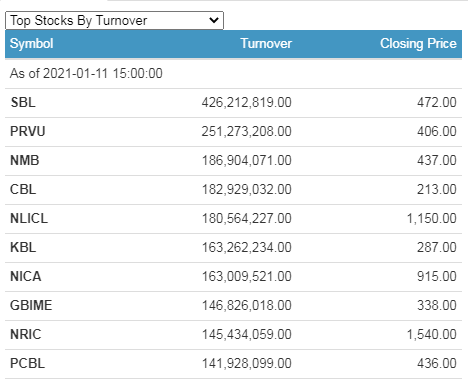 Siddhartha Bank Limited (SBL) has the highest individual scrip turnover of a little over Rs. 42.62 crores. Its shares also traded the most today.