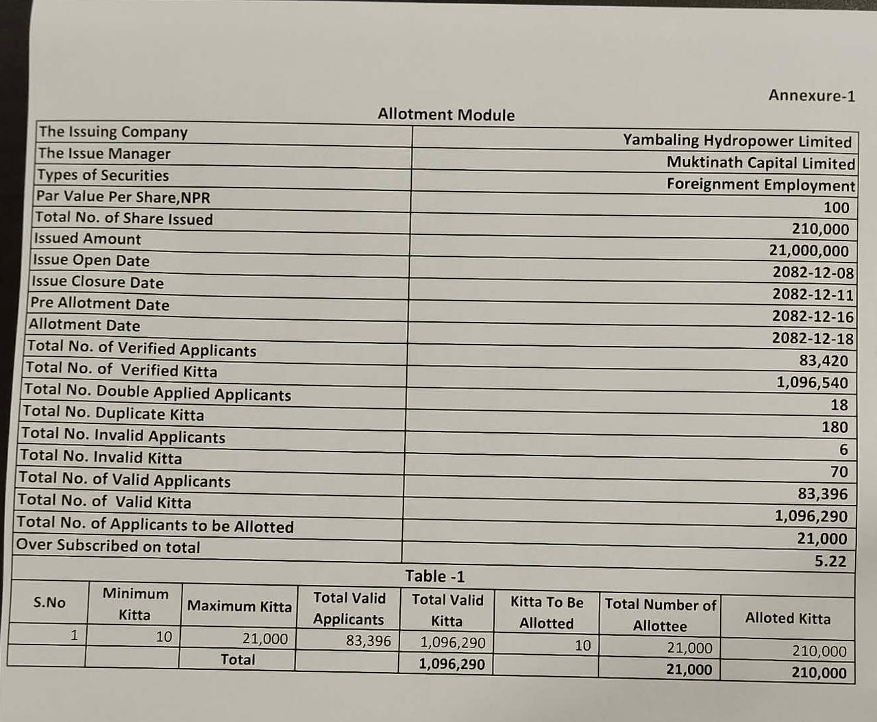 Yambaling Hydropower Limited Concludes IPO Allotment for Nepalese Citizens Working Abroad; 21,000 Lucky Applicants Receive 10 Units each